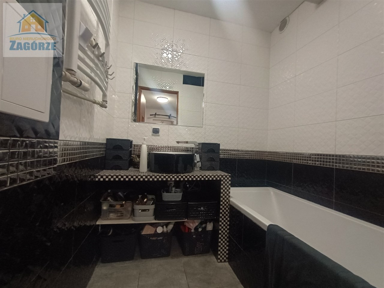Łazienka w kaflach z wanną, umywalką, lustrem, zamontowany nowy kaloryfer.