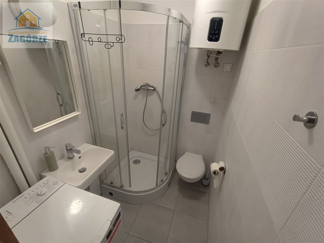 Łazienka w kaflach z kabiną prysznicową, umywalką, sedesem, lustrem, pralką, zamontowany bojler elektryczny.